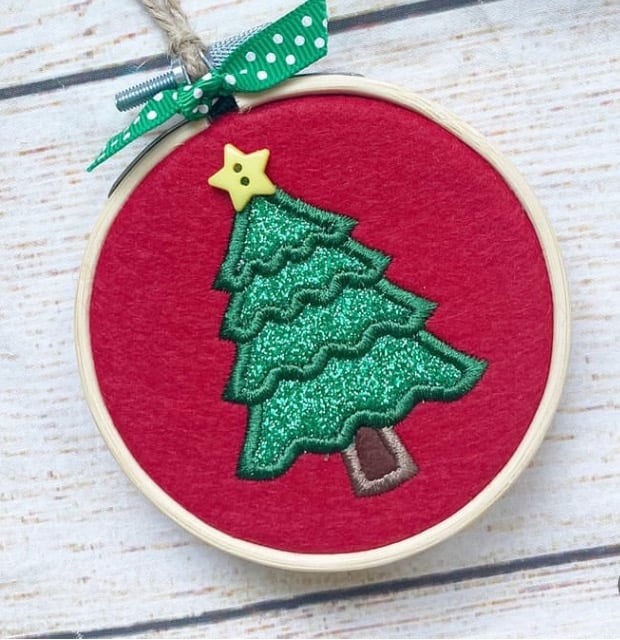 A 3 inch bamboo embroidery hoop featuring a Christmas Tree appliqué design.