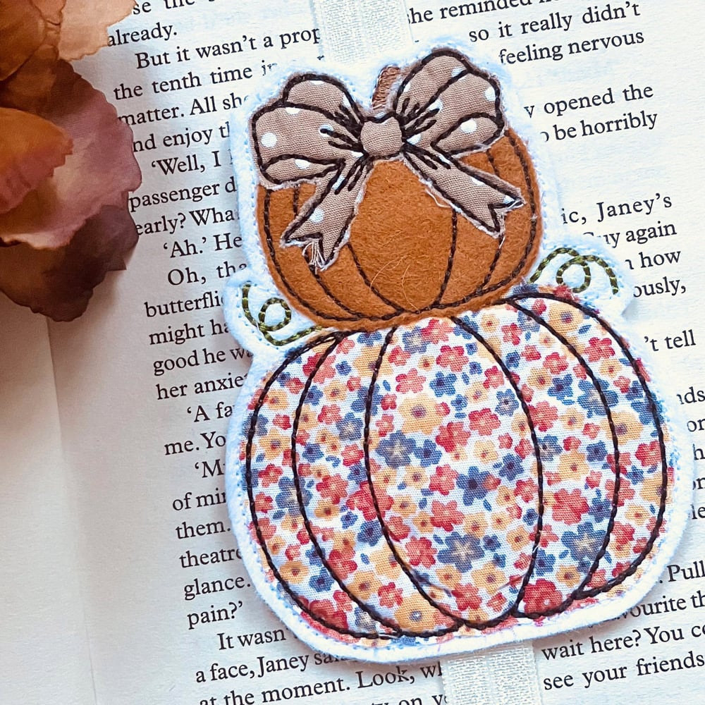 A book band featuring an embroidered pumpkin stack appliqué.
