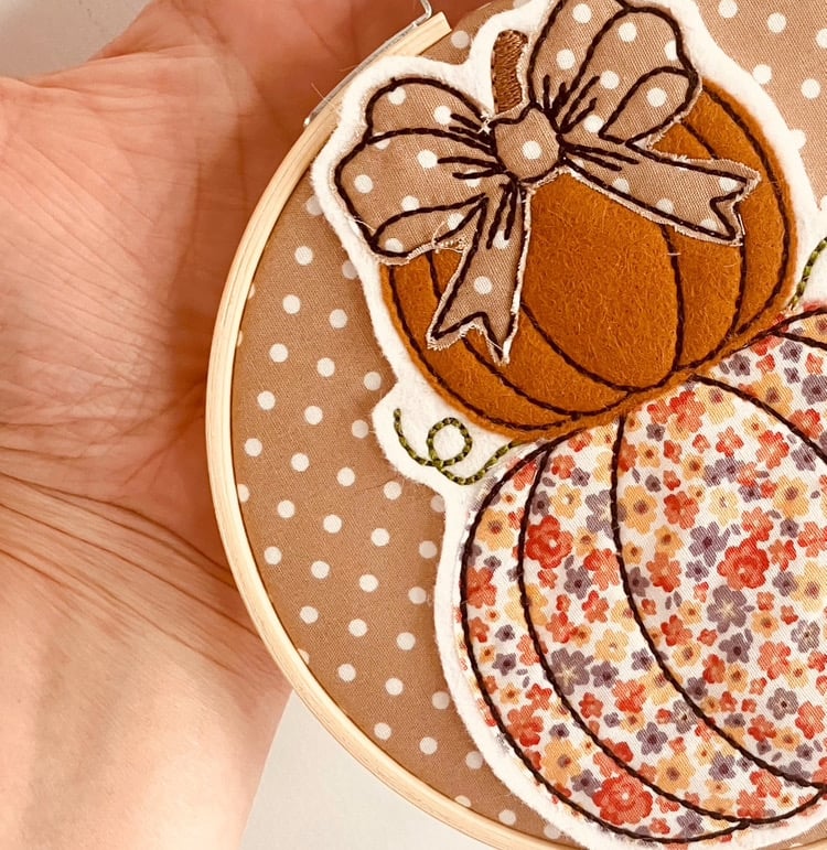 A 5 inch bamboo embroidery hoop, featuring a pumpkin stack appliqué design.